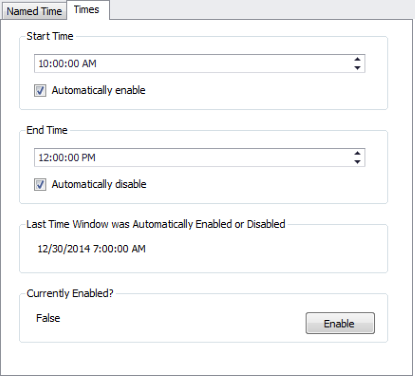 - Currently Enabled: True if the Named Time is enabled. Use the button to manually enable or disable the Named Time.