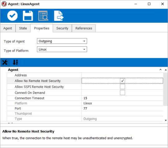 NOTE: After the Agent is created, it is recommended that you set up TLS communication. See Setting up Secure Communication with Outgoing JAMS Agents. This will be required for communication to occur. You will see the Agent state listed as Unauthenticated until this security is configured.