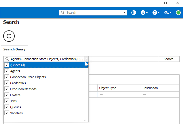 The Search option lets you use filters to search for one or more of the definitions listed below. Each item is searched by its name and description.