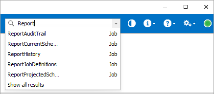 The JAMS Client has a Search bar at the top of the screen so you can search for definitions while you are on other screens within JAMS. You can search by name or description for the definition types listed above. The Search bar displays the top five results based on the text you enter and you can open the definition by clicking on the result. The Search view from the Shortcut menu is opened when you press Enter.